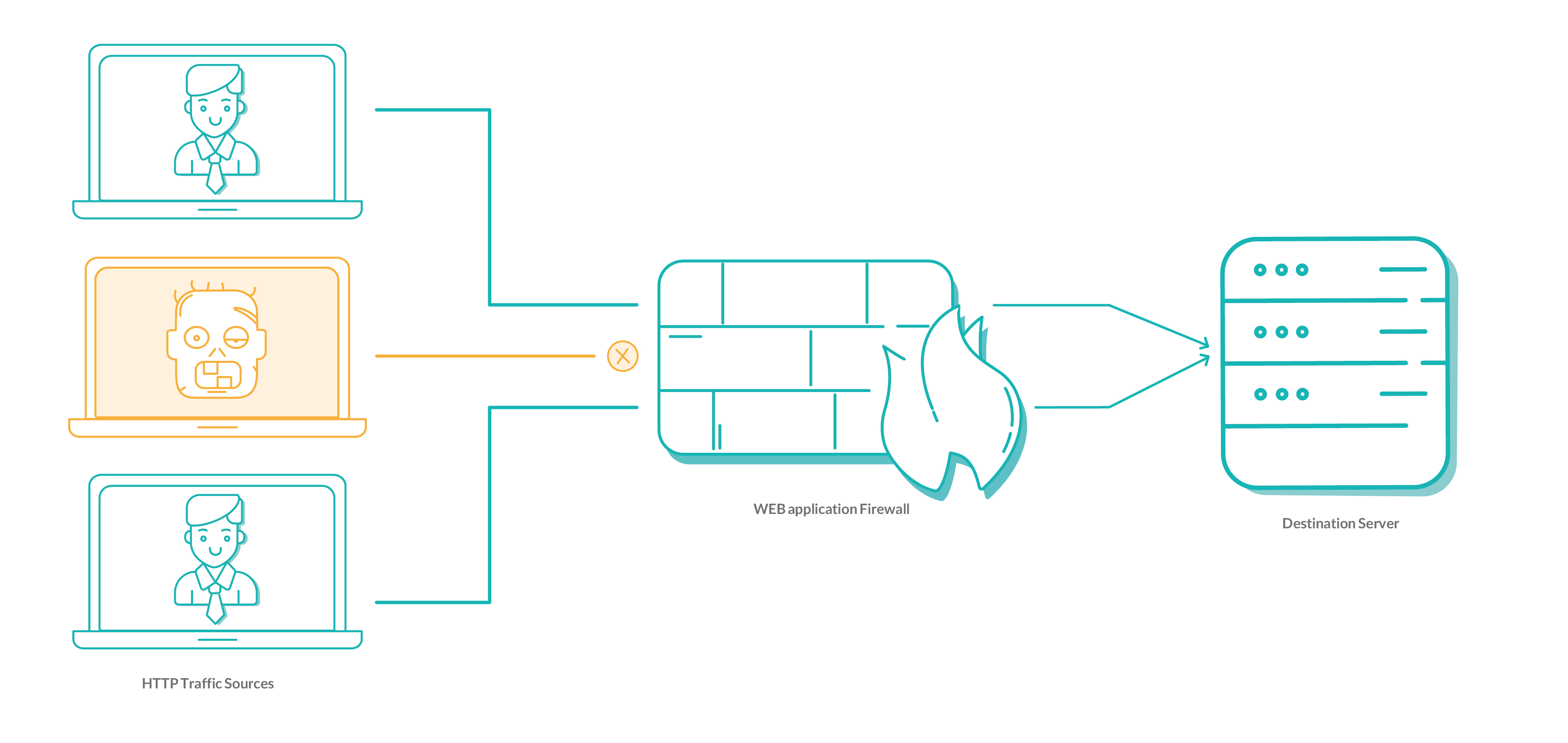 برای درک بهتر این‌که WAF چیست و چگونه عمل می‌کند، باید با نحوه‌ی تحلیل و فیلتر ترافیک توسط آن آشنا شویم. سرویس WAF در نقطه‌ای بین کاربران و برنامه‌های تحت وب قرار می‌گیرد و تمام ترافیک ورودی و خروجی را پیش از رسیدن به سرور اپلیکیشن بررسی می‌کند.