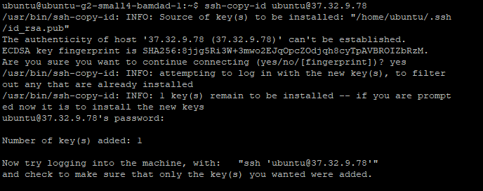 از شما خواسته می‌شود، اتصال به این سرور را تایید کنید. با نوشتن yes و سپس فشردن Enter، آن را بپذیرید. سپس پسورد سروری که می‌خواهید کلید در آن کپی شود را وارد کرده و Enter بزنید.