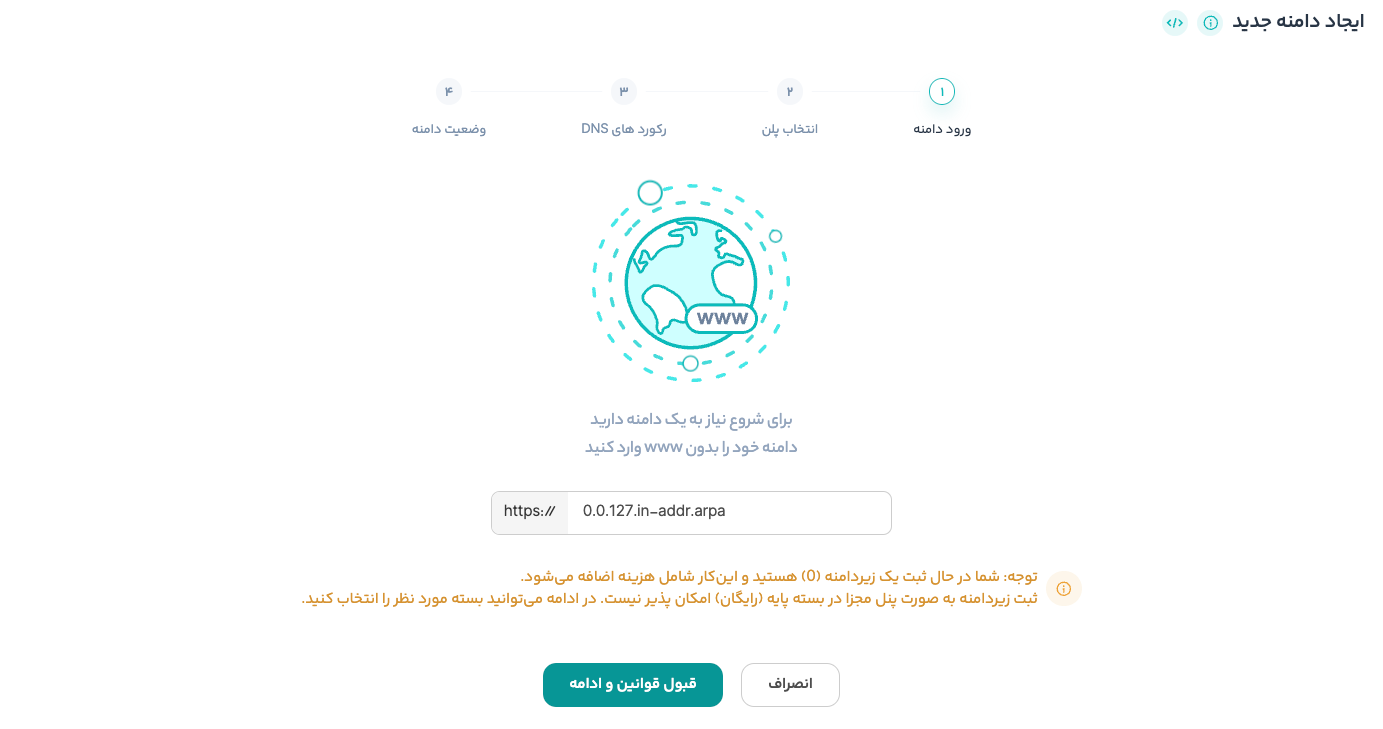 ابتدا لازم است دامنه‌ی arpa مربوط به رنج‌تان را به‌شکل زیر در آروان‌کلاد ثبت کنید. راهنمای ثبت دامنه در این مسیر به شما کمک می‌کند.