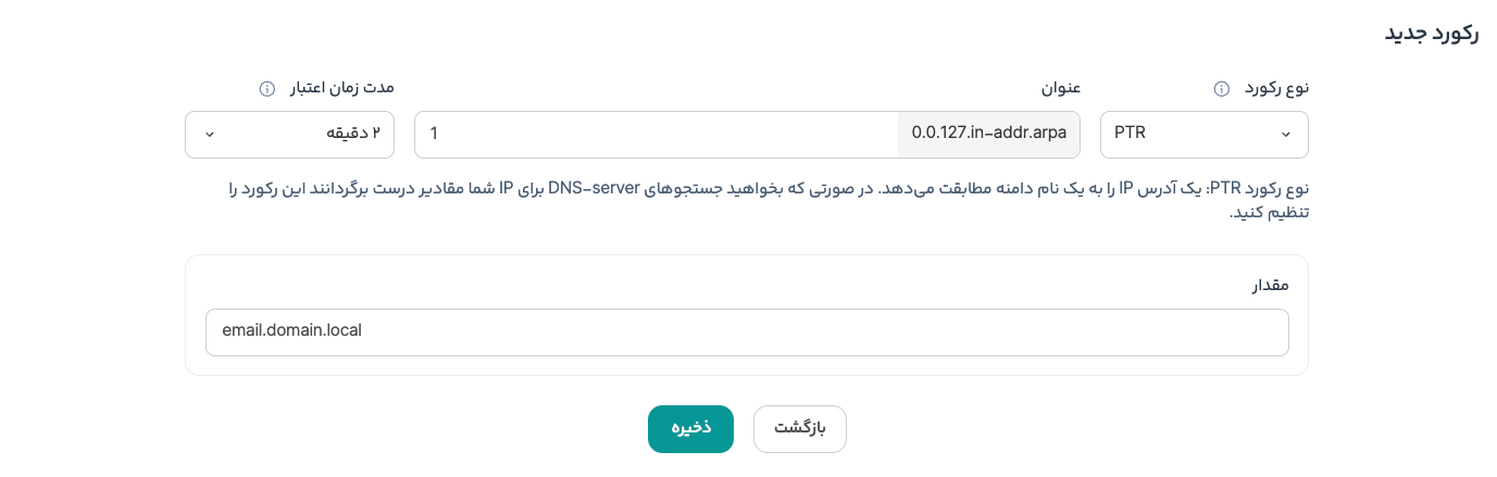 پس از ثبت دامنه، باید برای IPهای موردنظرتان رکوردهای PTR را تعریف کنید. برای نمونه برای 127.0.0.1 باید به‌شکل زیر رکورد را ثبت کنید.