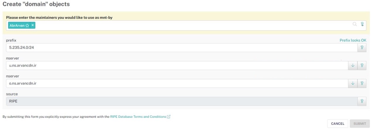 برای تنظیم NS در RIPE یک Object از نوع Domain ایجاد کنید و تنظیمات را مانند تصویر نمونه‌ی زیر انجام دهید.