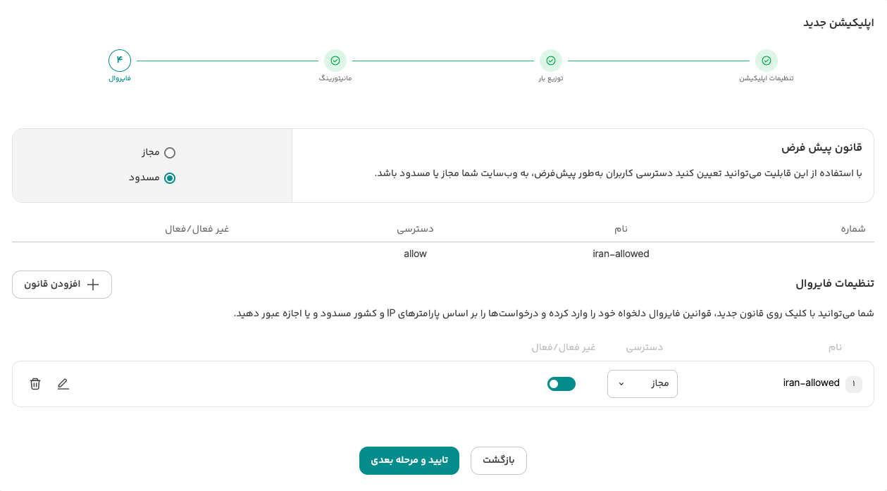 فایروال: در بخش فایروال اپلیکیشن، یک قانون جدید تعریف کنید. برای مثال، دسترسی را برای تمامی کشورها مسدود و فقط برای کشور ایران مجاز کنید.