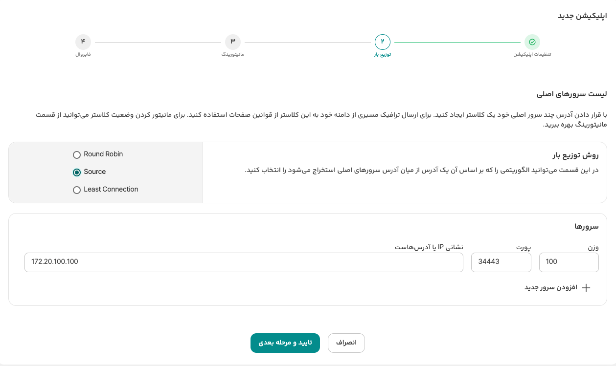 تنظیمات توزیع بار: آدرس IP ابرک و پورت ۴۵۳۲۲ را در بخش «سرورها» وارد کنید و روش توزیع بار را روی Source قرار دهید تا پایداری Session حفظ شود.