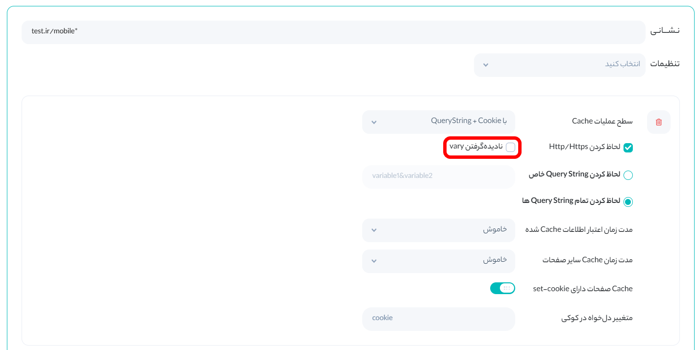 اگر وب‌سایت شما دارای نسخه‌های متفاوتی است که برای کاربران مختلف باید نسخه‌ی متناسب با مرورگر آن کاربر نمایش داده شود (برای نمونه نسخه‌ی متناسب برای کاربران اندروید و نسخه‌ی متناسب برای کاربران iOS) می‌توانید در بخش قوانین صفحات در پنل کاربری ابر آروان، برای هر یک از این مصارف، قانونی تعریف و گزینه‌ی لحاظ کردن هدر vary را برای آن فعال کنید.