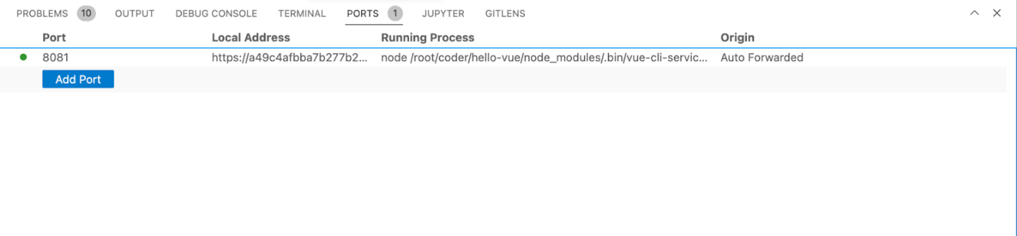 پس از ذخیره‌ی تغییرات و اجرای اپلیکیشن می‌توانید از قسمت PORTS ببینید که برنامه‌ی شما چه پورتی را با چه آدرسی باز کرده است.
