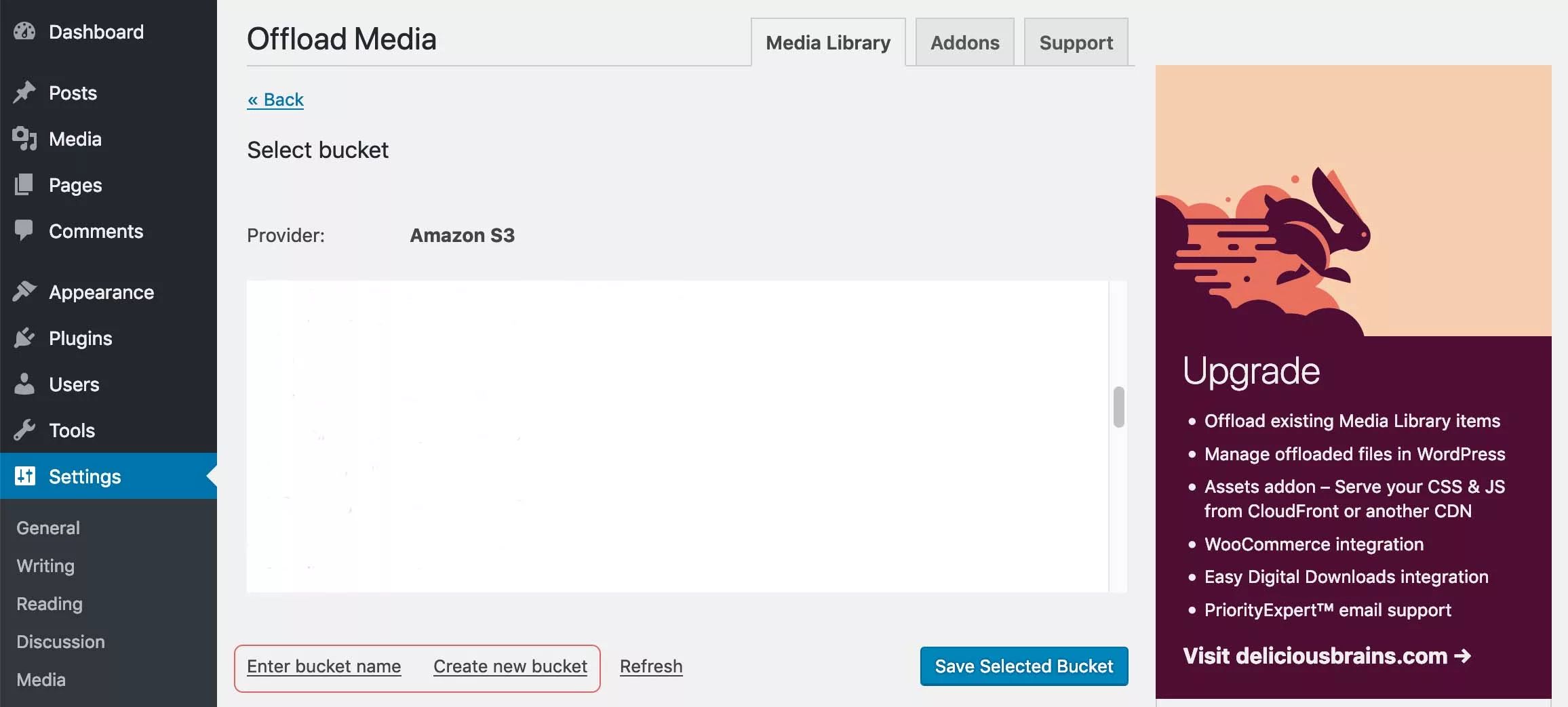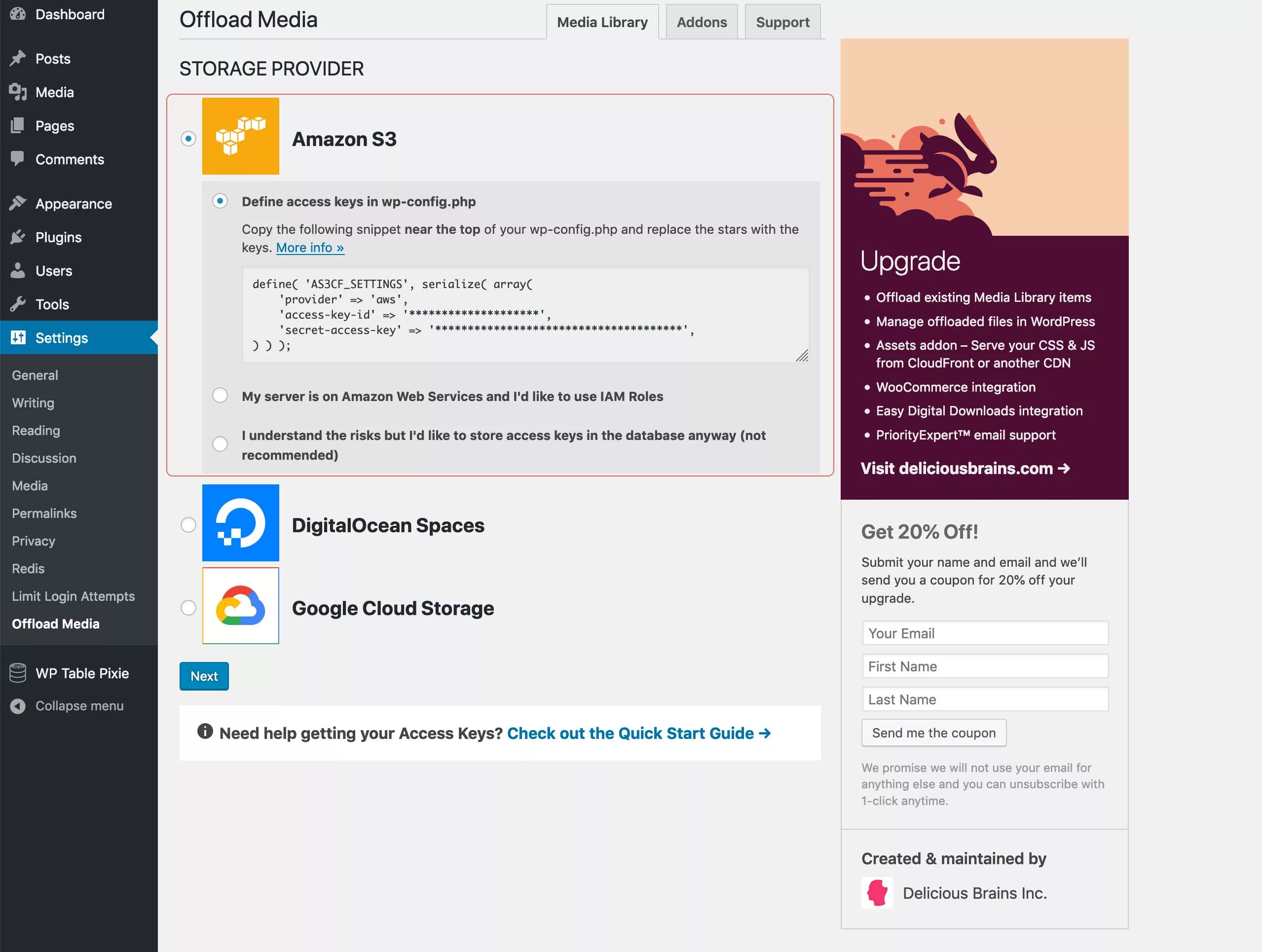 در ادامه پس از نصب افزونه‌ی وردپرسی WP Offload Media Lite از طریق بخش افزونه‌های وردپرس، از بخش تنظیمات وردپرس گزینه‌ی Offload Media را انتخاب کنید. در صفحه‌ی بعد، گزینه‌ی Amazon S3 و سپس Define access keys in wp-config.php را انتخاب کنید و روی دکمه‌ی Next کلیک کنید.